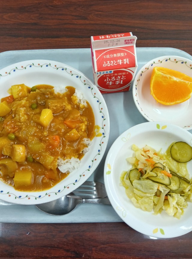 メニューは牛乳、ハーブサラダ、カレーライス、愛マドンナです。カレーライスはご飯が進むメニューです。ハーブサラダは機械の故障で温かい提供になりました。