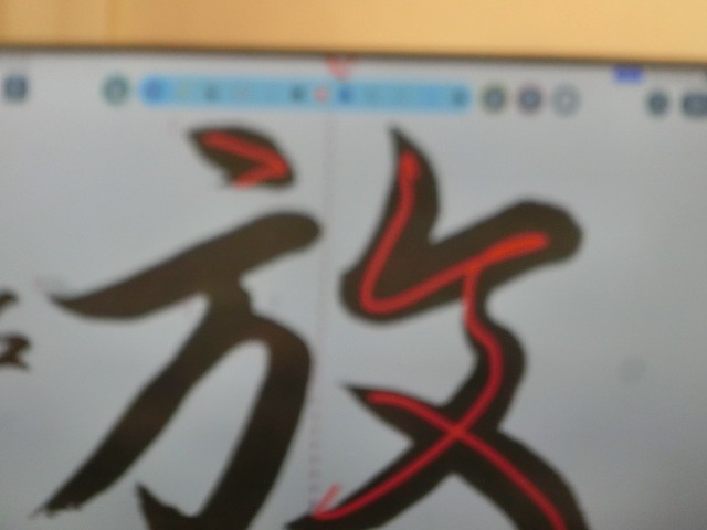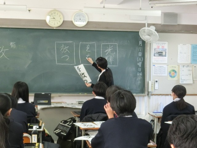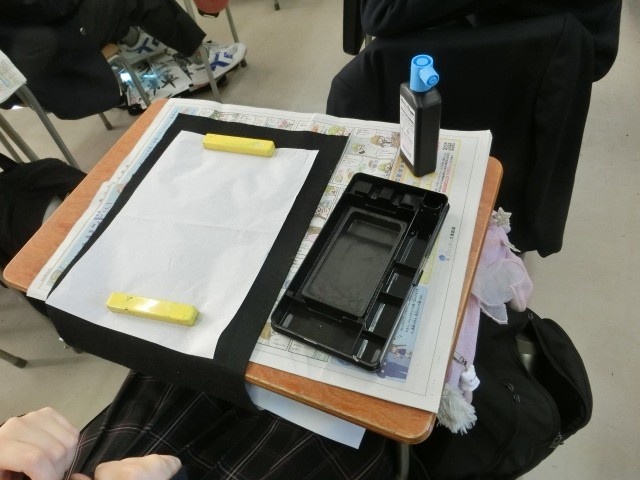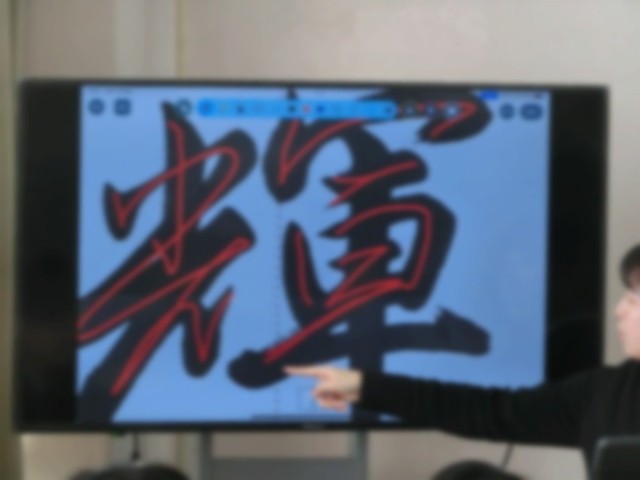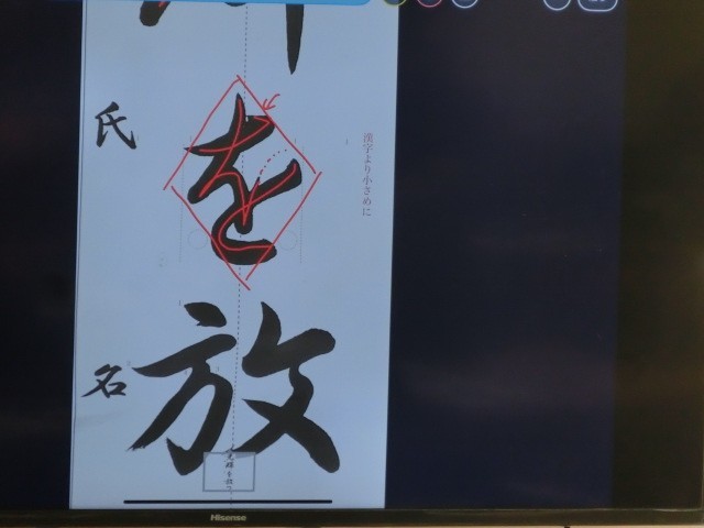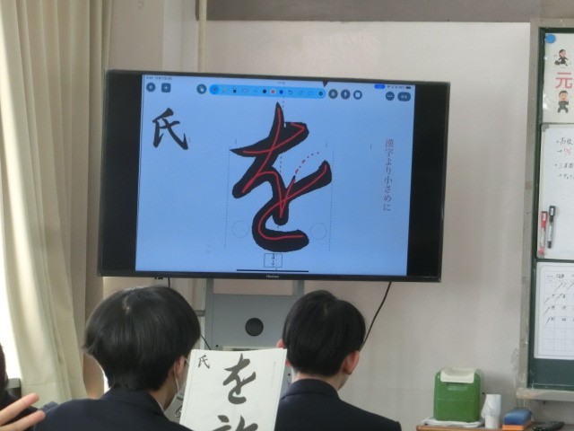 2年生の書初めの行書は「光輝を放つ」です。先生から大型テレビで筆の運び方を丁寧に説明していただきました。また、書初め用紙は数が限られているので半紙での練習の方法もご指導いただきました。また、先生が各個人の名前の楷書と行書のお手本を作成して配布されているので、書初めの際、名前もきちんと書けますね。