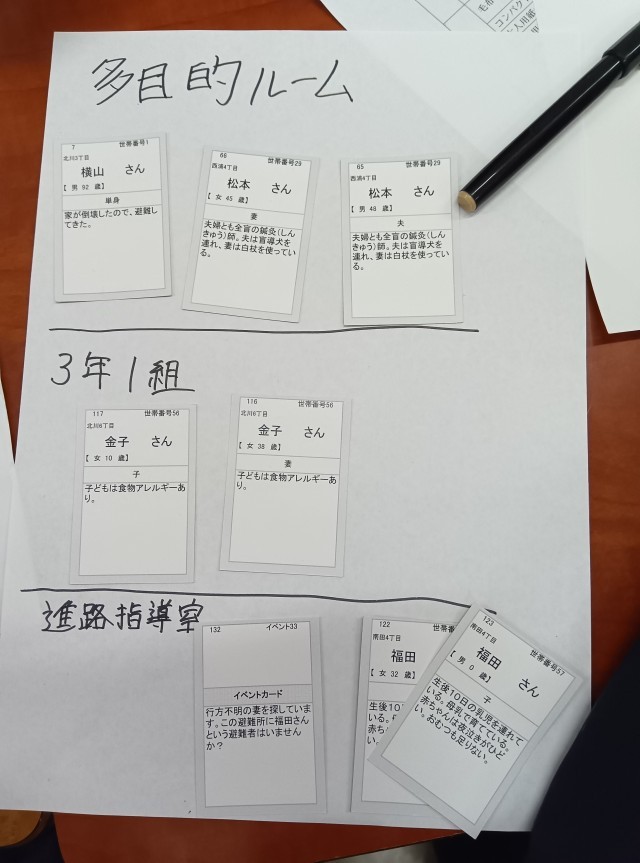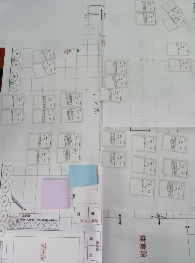 HUGとは、体育館や教室に見立てた平面図を使用して、避難者が抱える事情や避難所で起こりうる場面にどう対応していくかを疑似体験するゲームです。