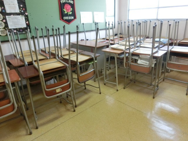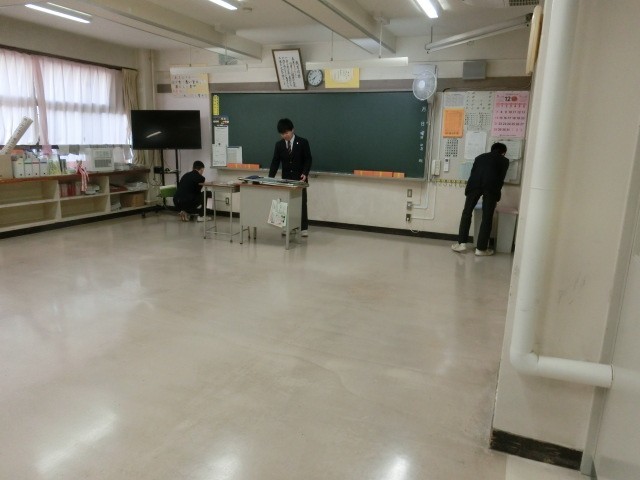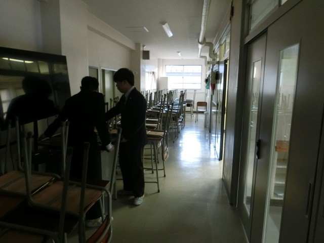 早めに登校した生徒たちがワックがけが終わった教室に机等を運び込んでいます。