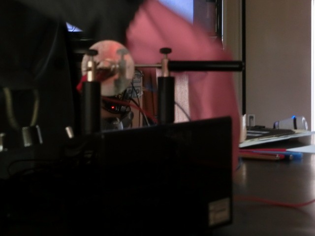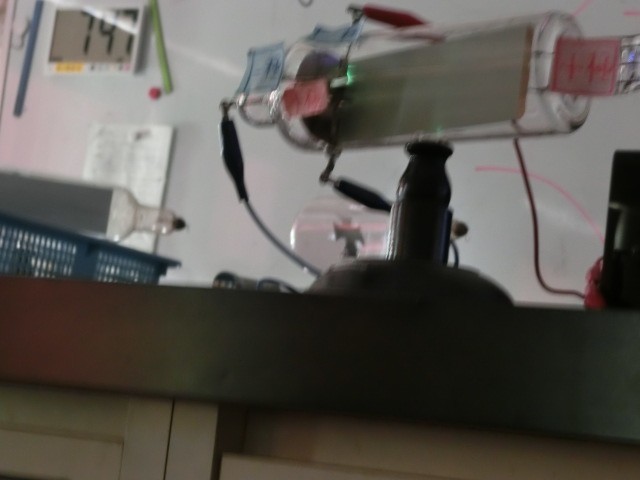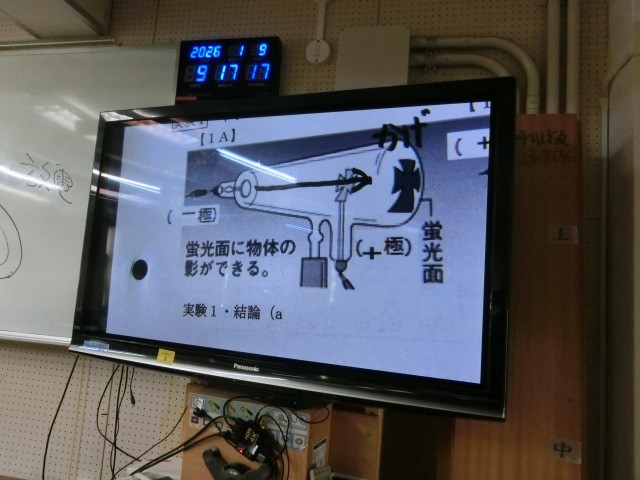 理科の授業では「電流の正体」で実験を行いました。クルックス管という装置を使い、陰極線を観察しました。この実験では電磁波や放射線が出るため、実物提示装置の画像が乱れることがありそちらの方も生徒たちは驚いていました。