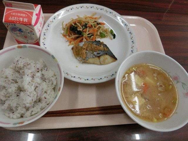 メニューは牛乳、ゆかりご飯、鰆の香味焼き、野菜の胡麻和え、豚汁です。今日の給食には21品目の食品が使われています。1日30品目以上の摂取が望ましいとされているのであと9品目、朝食・夕食で食べてみましょう。