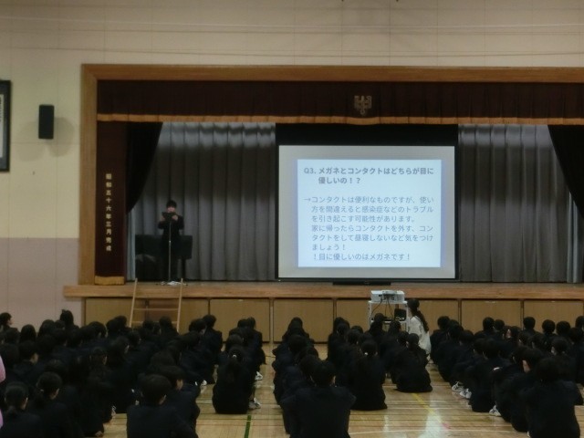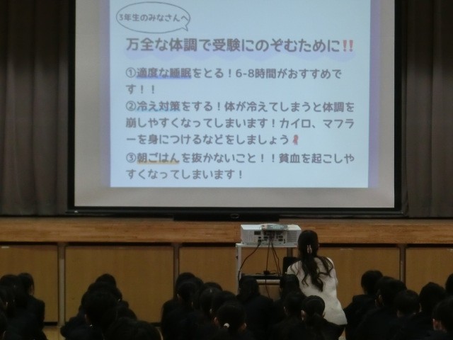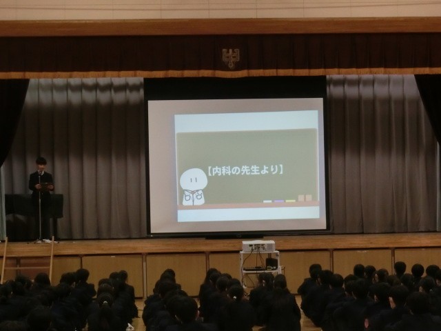 本日の生徒朝会は生徒会長のあいさつ、保健衛生委員の報告がありました。保健衛生委員は学校保健委員会として校医の先生方に質問をし、その回答の一部を生徒朝会で発表しました。