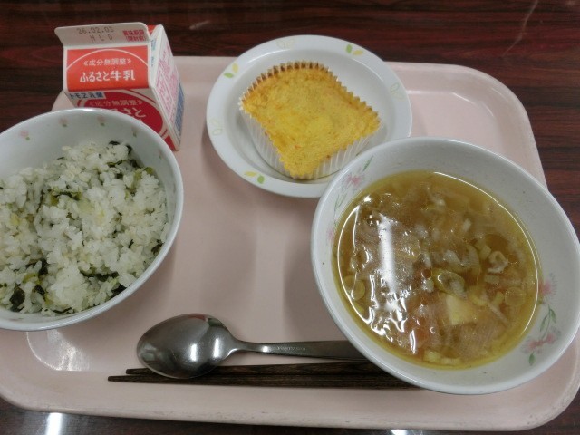 メニューは牛乳、菜飯、千草やき、けんちん汁です。菜飯は給食らしく塩味ではなく素材のうまみを感じます。残さず食べましょう。