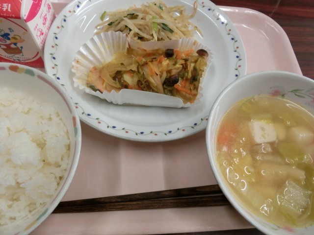 メニューは牛乳、ごはん、鮭のちゃんちゃん焼き、もやしとにらの胡麻風味、豆腐汁です。ちゃんちゃん焼きは北海道の郷土料理です。野菜と鮭という栄養バランスが取れている料理なので、残さず食べましょう。