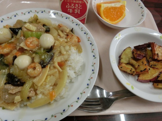 メニューは牛乳、中華丼、大学芋、柑橘のしらぬいです。大学芋は食物繊維が豊富なサツマイモです。残さず食べましょう。