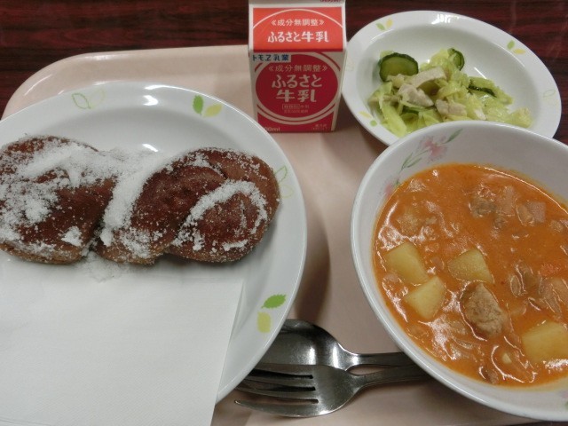 メニューは牛乳、ココア揚げパン、ハンガリアンシチュー、ハムサラダです。ココア揚げパンは砂糖ががかりスイーティな味わいです。バレンタインデーにちなんだメニューです。残さず食べましょう。