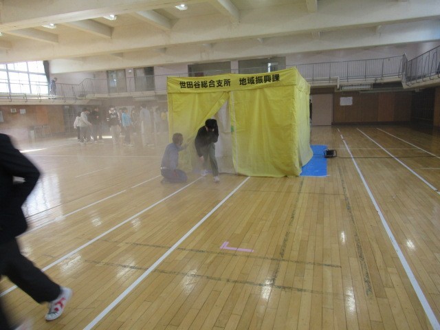煙を充満させたテント内で火災の疑似体験を行い、避難行動を学びました。
