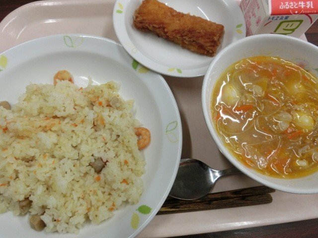 メニューは牛乳、イカのから揚げ、チャーハン、ピリ辛味噌スープです。今日の給食の野菜は、しょうが、ニンジン、ネギです。夕食に多めに野菜を食べると栄養バランスが取れますね。