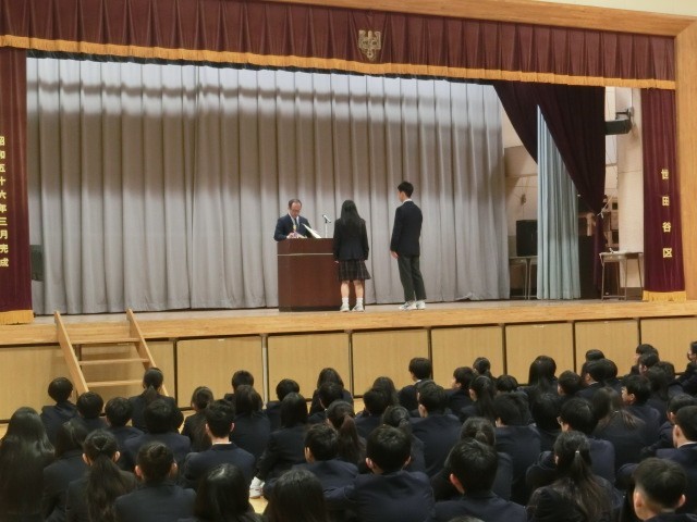 全校朝会は、校長先生のお話、表彰、生活指導主任の先生のお話でした。表彰は、「社会を明るくする運動」の作文、全国美術画コンクール、部活動は卓球部、バドミントン部でした。