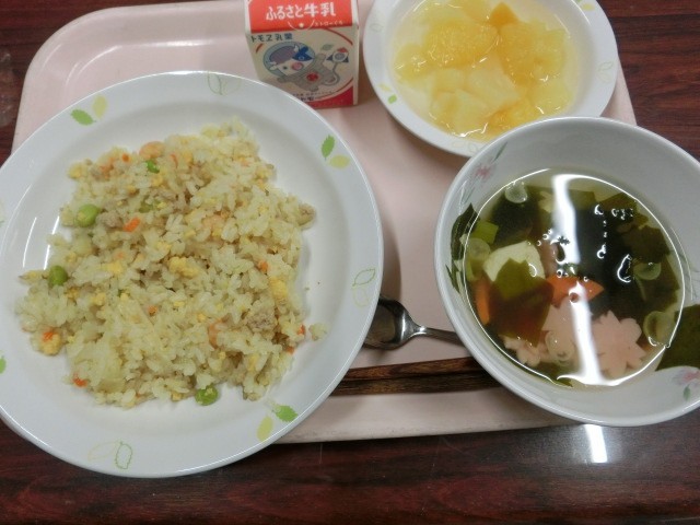 メニューは牛乳、そぼろ寿司、すまし汁、フルーツポンチです。今日はひな祭りなので、かまぼこは桃の花の形です。