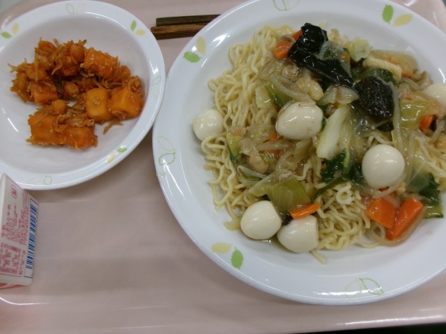 メニューは牛乳、カルシウムビーンズ、五目あんかけ焼きそばです。今日明日は1.2年生のみの給食です。残さず食べましょう。