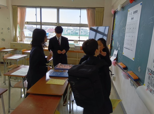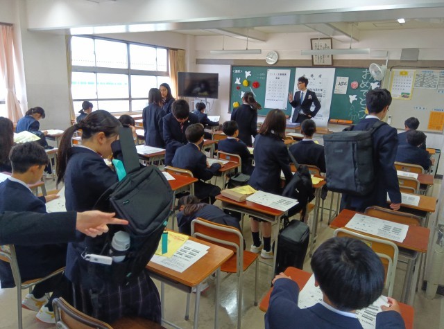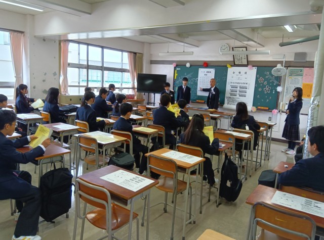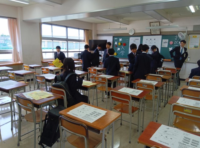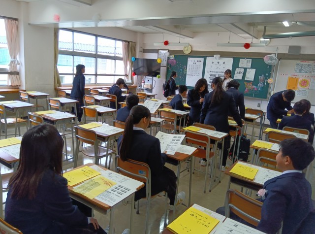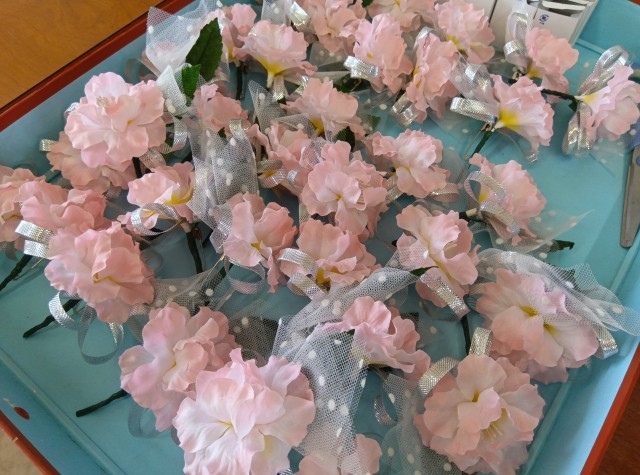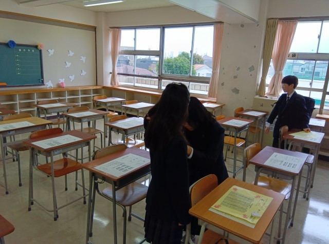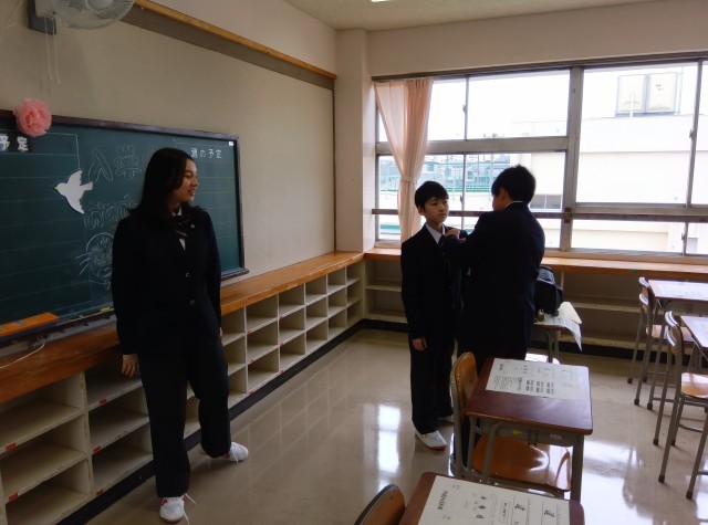 入学式前、旧2年生の学年委員が1年生にお花と校章をつけました。駒留中学校の生徒の証です。