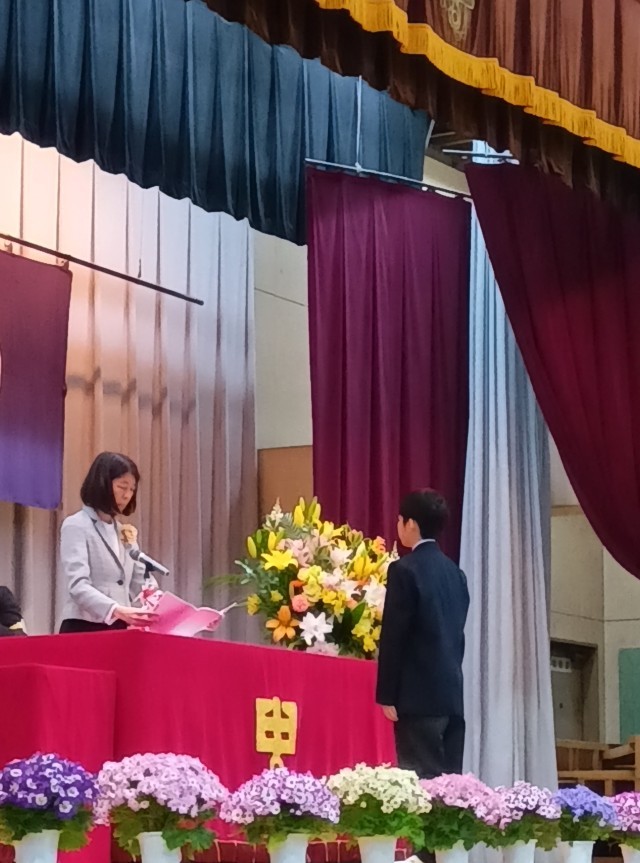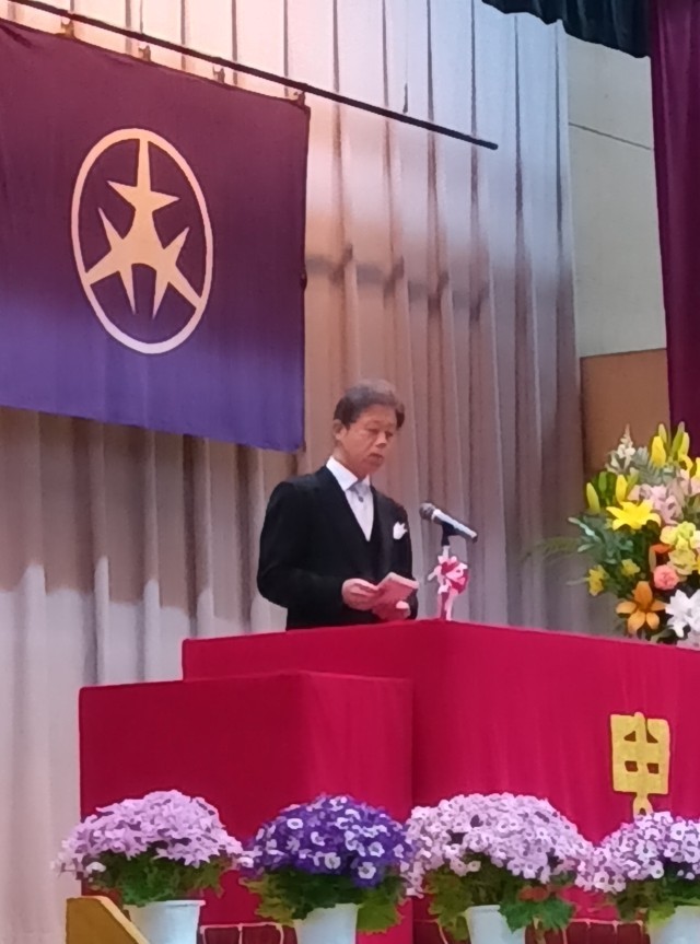 校長先生の式辞をしっかりと聴く新入生。立派な1年生にです。PTA会長から記念品の目録もいただきました。