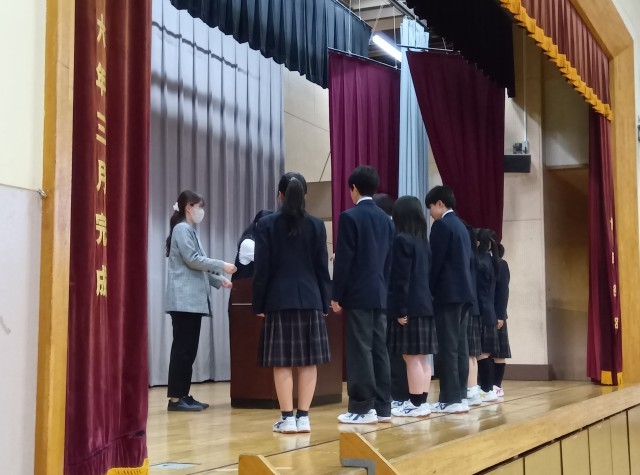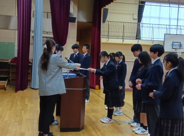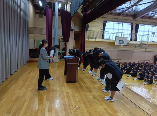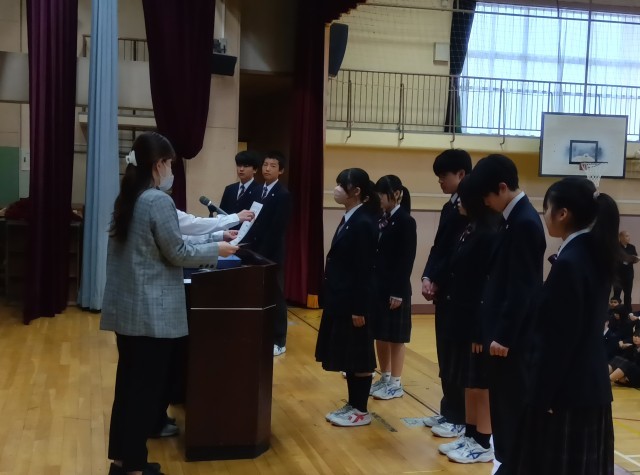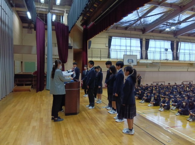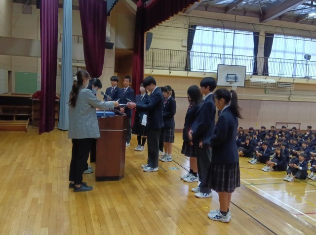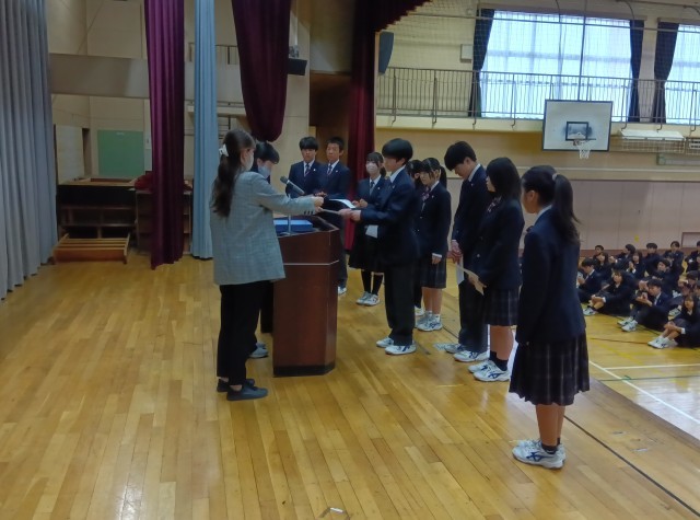 今日の生徒朝会は、専門委員の任命式です。各学年の学年委員長、専門委員会委員長画代表して、任命書を受け取りました。