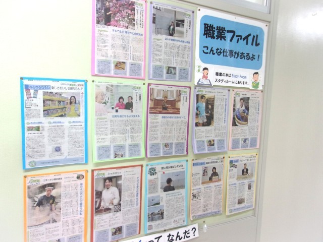 今は「春の一番くじ!」なんていうイベントもやっていたり、新入生向けに部活動コーナーを作ってくれていたりします。また、職業調べに向けての壁新聞や英検対策グッズもおいてありました。