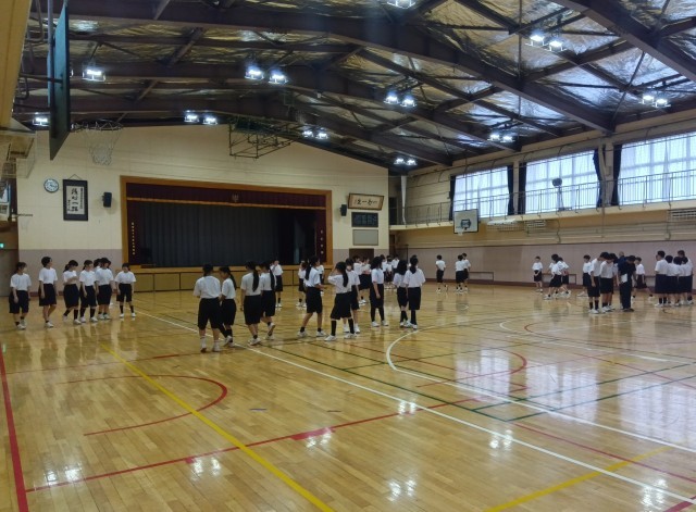 体育館ではグループで、行進などの集団行動の練習をしています。みなさん自主的に取り組んでいます。
