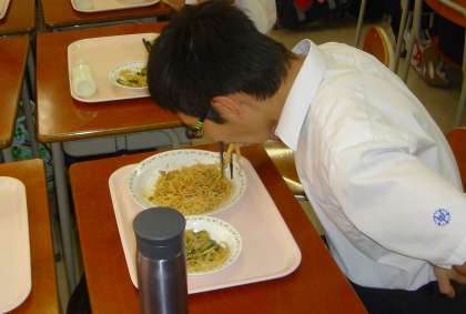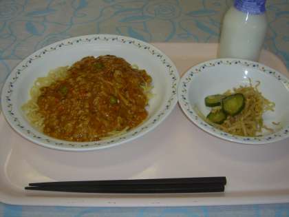 2学期最初の給食のメニューは、ジャージャー麺、きゅうりともやしのごま酢あえです。
