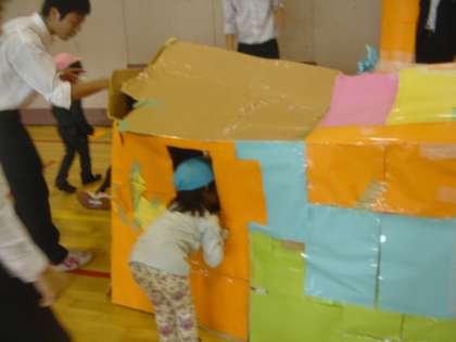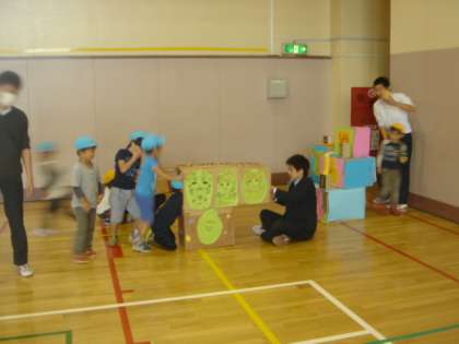 今日は、3年1組が、おともだち保育園の園児さんと、おもちゃで楽しく交流しました。
