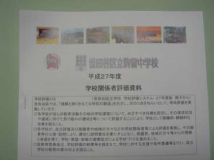 平成27年度 駒留中学校 学校関係者評価資料を作成しました。昨年11月に、生徒・保護者・地域関係者ご協力いただきました「学校評価アンケート」を「学校関係者評価委員」の方々が、分析し提言をまとめました。それをもとに、校長が次年度に向けた改善策を作成いたしました。全部で22ページありますので、全保護者への配布はできませんが、このホームページの、「表紙」ページの一番下に、貼り付けました。ご覧ください。
