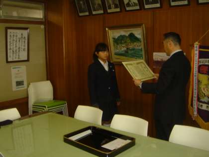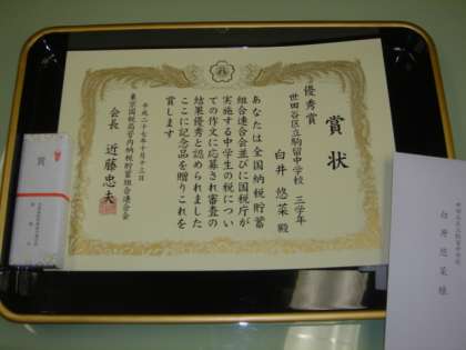 3年生のSさんが、『税についての作文』で、「東京国税局管内納税貯蓄組合連合会優秀賞」をいただきき、世田谷納税貯蓄組合連合会の会長から表彰状を授与されました。