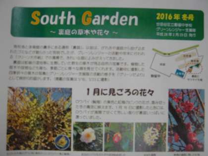 グリーンレンジャー支援隊の方が、South Gargen 2016冬号を作成しました。四季折々の裏庭の草花の紹介や、管理の様子などをお知らせしていただけるとのことです。校内の掲示や、HPの「配布文書」の「各種お知らせ」でご覧下さい。