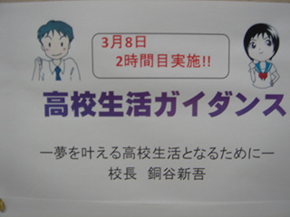 3/8に、高校生活の良いスタートができるように、校長先生が「高校生活ガイダンス」の講座を実施します。高校での学習、成績、学校生活、部活動、大学入試についての話や、どのような高校生活を送るべきかをパワーポイントでわかりやすくお話をします。