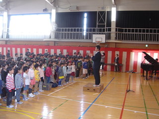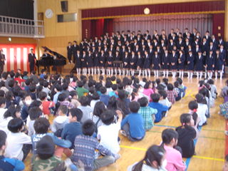3年生は、響きの学び舎の3小学校で合唱交流をします。今日は、旭小学校にお邪魔して、「大地讃頌」「ケサラ」「ほらね」の3曲を披露、最後に「翼をください」を小学生・中学生全員で合唱しました。