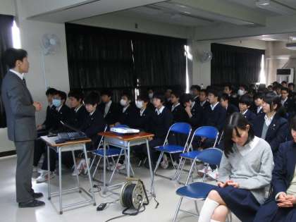 銅谷校長先生から、パワーポイントで「高校生活ガイダンス」の授業を受けました。