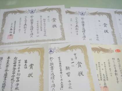 連休中の試合で、野球・バレー・バドミントン・卓球などを表彰しました。その他の部活動も頑張っています。学習も部活動も頑張れる駒留中にしましょう。