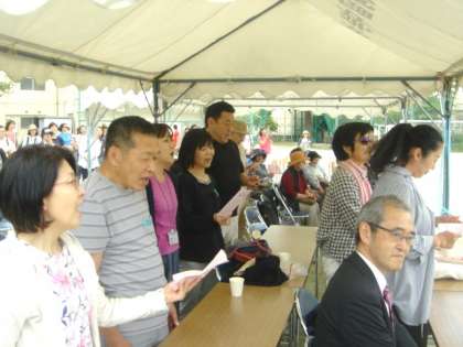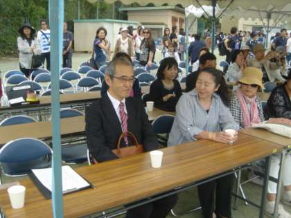 校歌を作曲した服部正先生は、8年前に100歳でお亡くなりになっていますが、ご遺族が、遺品を整理していたところ、本校の校歌の直筆譜面を発見されました。今日の運動会にあわせて、ご長男の服部賢様にご来校いただきましたので、服部様の前で、全校生徒・同窓会で校歌を斉唱しました。
