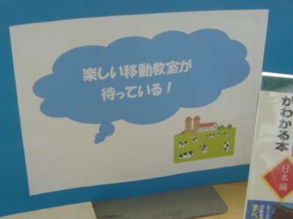 1年生は、移動教室に向けた学習のため、廊下に図書館の資料を並べています。