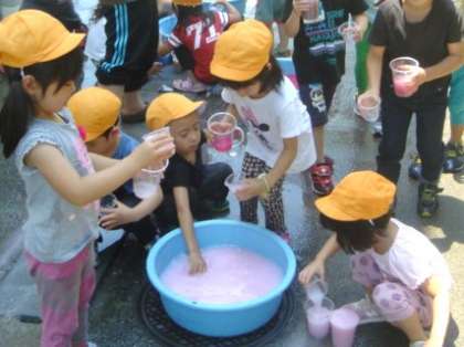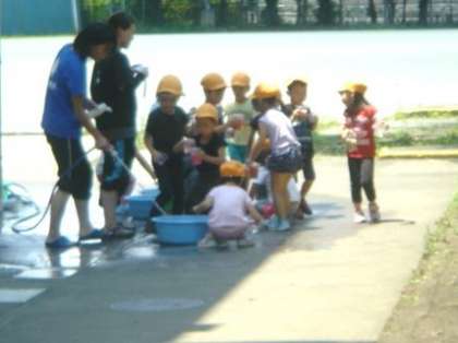 おともだち保育園の園児さんたちが、水遊びをしています。