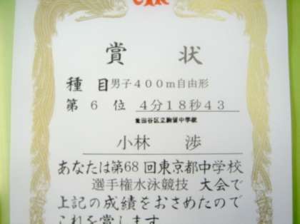 3年生小林君 400M自由形で東京都6位になり8月9日からの関東大会出場です。