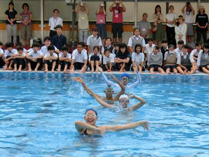 石黒様から指導を受けて、銅谷校長、代表生徒2名でシンクロの演技を披露しました。