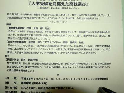 「大学受験を見据えた高校選択」をテーマに、都立高校・私立高校の校長先生、銅谷校長の3名で、シンポジウムをします。都立・私立の大学進学指導の特色や、今後の変化する大学入試への対応などのお話しをしていただきます。3年生保護者はもちろん、1・2年生保護者もぜひ参加してください。