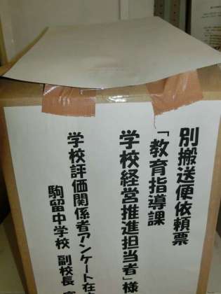 学校関係者評価アンケートにご協力ありがとうございます。回収が終了して、段ボール1個になりました。教育委員会に送付して集計を始めます。回収率は前年に比べて、保護者が79.3%(前年70%)、地域関係者71.9%(前年61%)と上昇しました。ご協力ありがとうございます。今後は集計後の資料を、学校評価委員の皆さんが分析し、提言を作成していただきます。