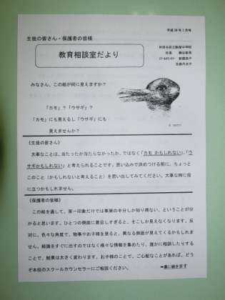 教育相談だよりを配布しました。『カモ』にも『ウサギ』にも、見えます、このように、様々な視点で見ることも大切ですね。