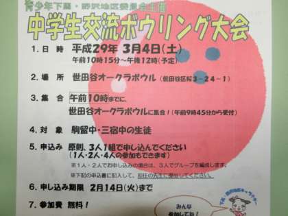 3月4日(土)に実施される。青少年下馬・野沢地区委員会主催の「中学生交流ボウリング大会」のお知らせを配布しました。
