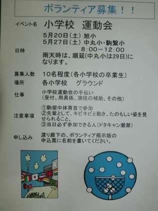 毎年実施していますが、小学校運動会でのボランティア募集をします。希望者は、2階の渡り廊下の申込用紙に記入してください。