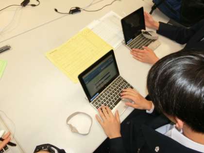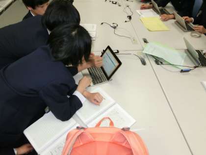 来週の修学旅行に向けて、班行動時の交通機関の料金や時間、拝観料などを会計係の生徒が、タブレットパソコンで確認しています。