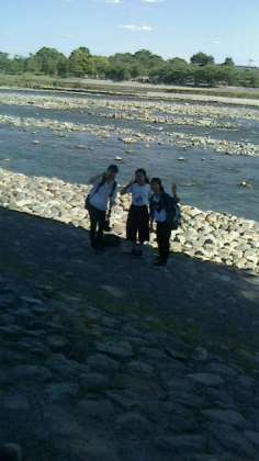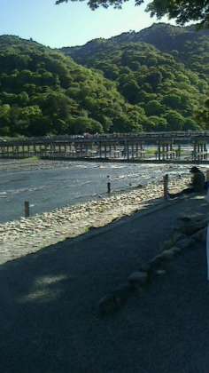 嵐山のバス集合場所の前は渡月橋と早くついた生徒が鴨川で涼んでます♪