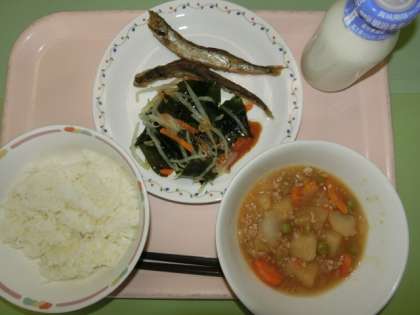 ししゃものから揚げ、ジャガイモのそぼろ煮、わかめともやしのサラダ、ごはん 純和風ですね。