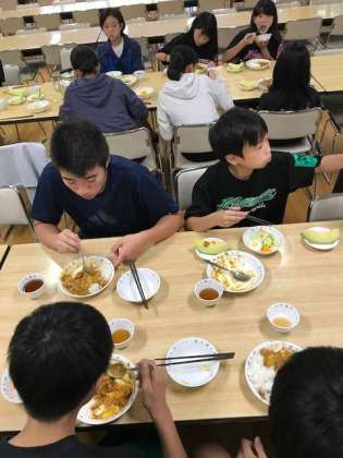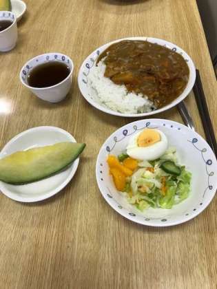 夕食は、カレー サラダ メロン おかわり続出です。