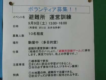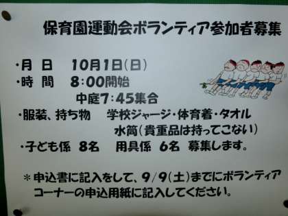 避難所運営訓練と、おともだち保育園「うんどうかい」のボランティアを募集します。