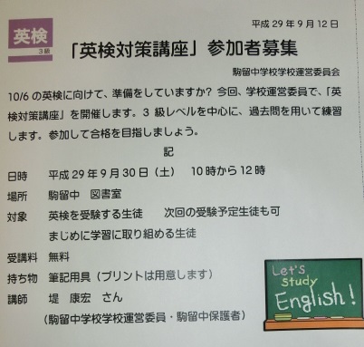 10/6の英検に向けて、対策講座を実施します。「お知らせ」からも、ダウンロードできます。