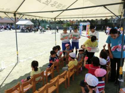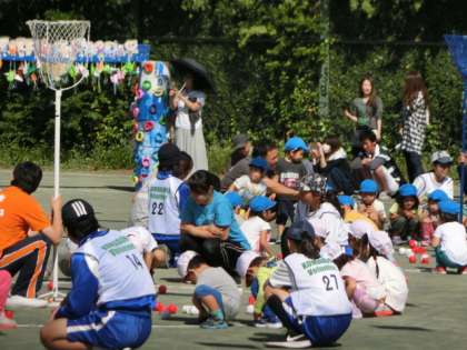 ボランティアとして、準備、競技の補助、園児さんのお世話をしました。