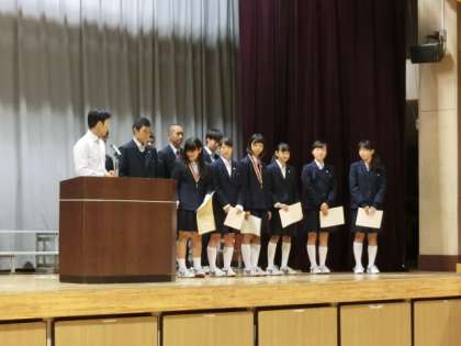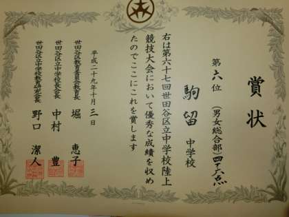先日の「世田谷区陸上大会」の入賞者と団体6位の表彰をしました。