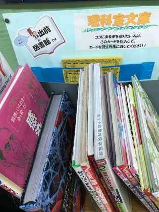 第一理科室の中に、図書室にある自然科学に関する本を置いたささやかなスペースを作りました。授業単元の内容からタイムリーな本を選んで置いています。授業前後に眺めてみてください。貸出も可能です。