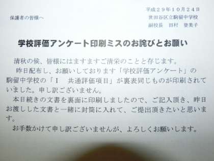 昨日配布した、学校評価アンケート(保護者向け)に両面が同じ印刷のものがありました。本日、裏面を配布しましたので、こちらを2枚目として活用ください。申し訳ございません。